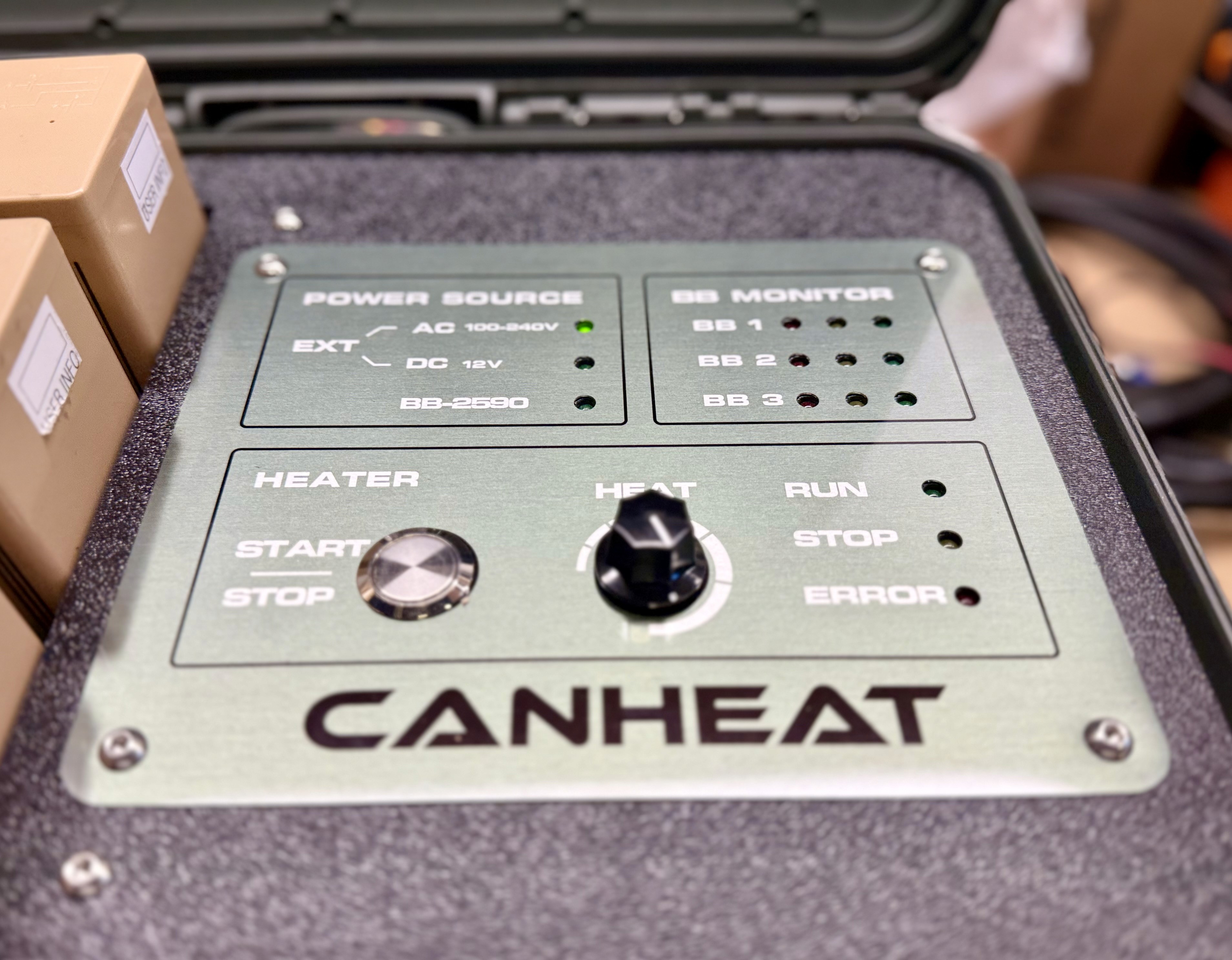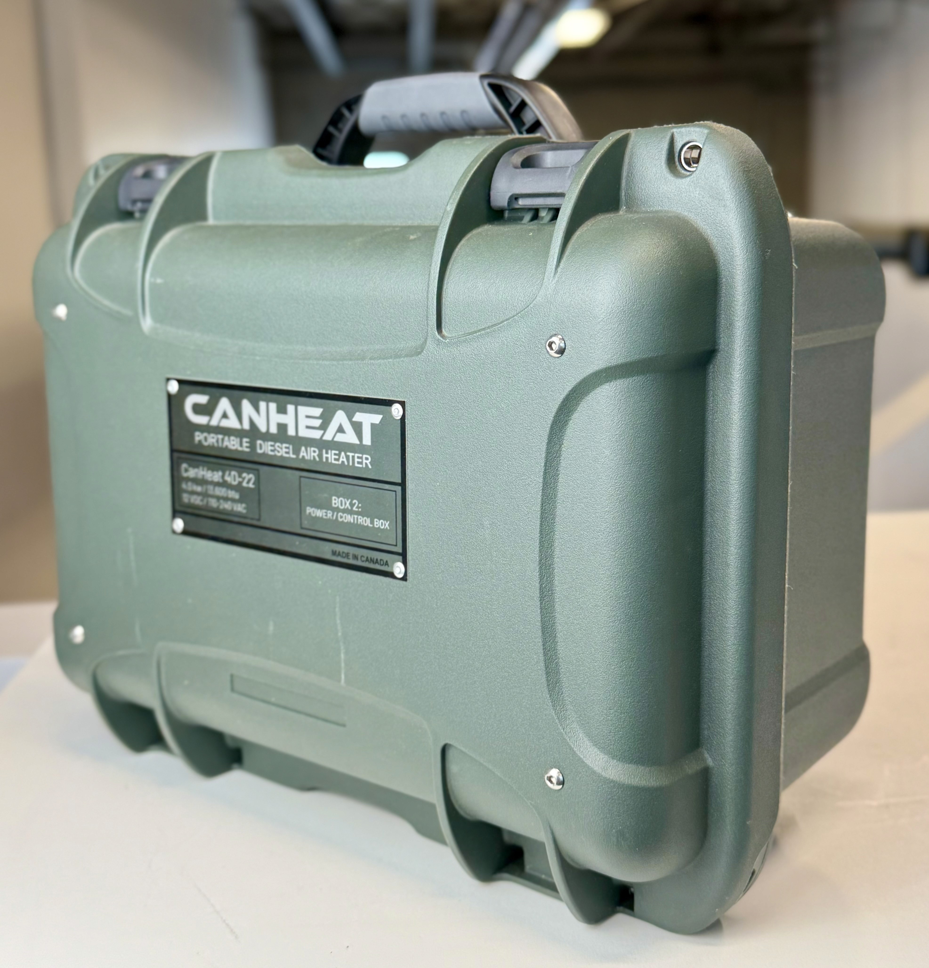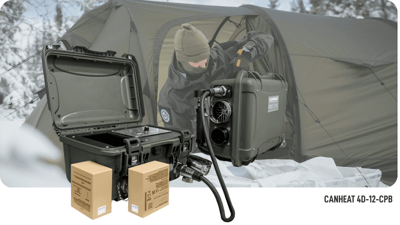 A dual-box heating system built for extended autonomy, drawing power from NATO-standard BB-2590 batteries, or with external AC and DC inputs. Compact and self-contained, it delivers silent heat in off-grid environments.