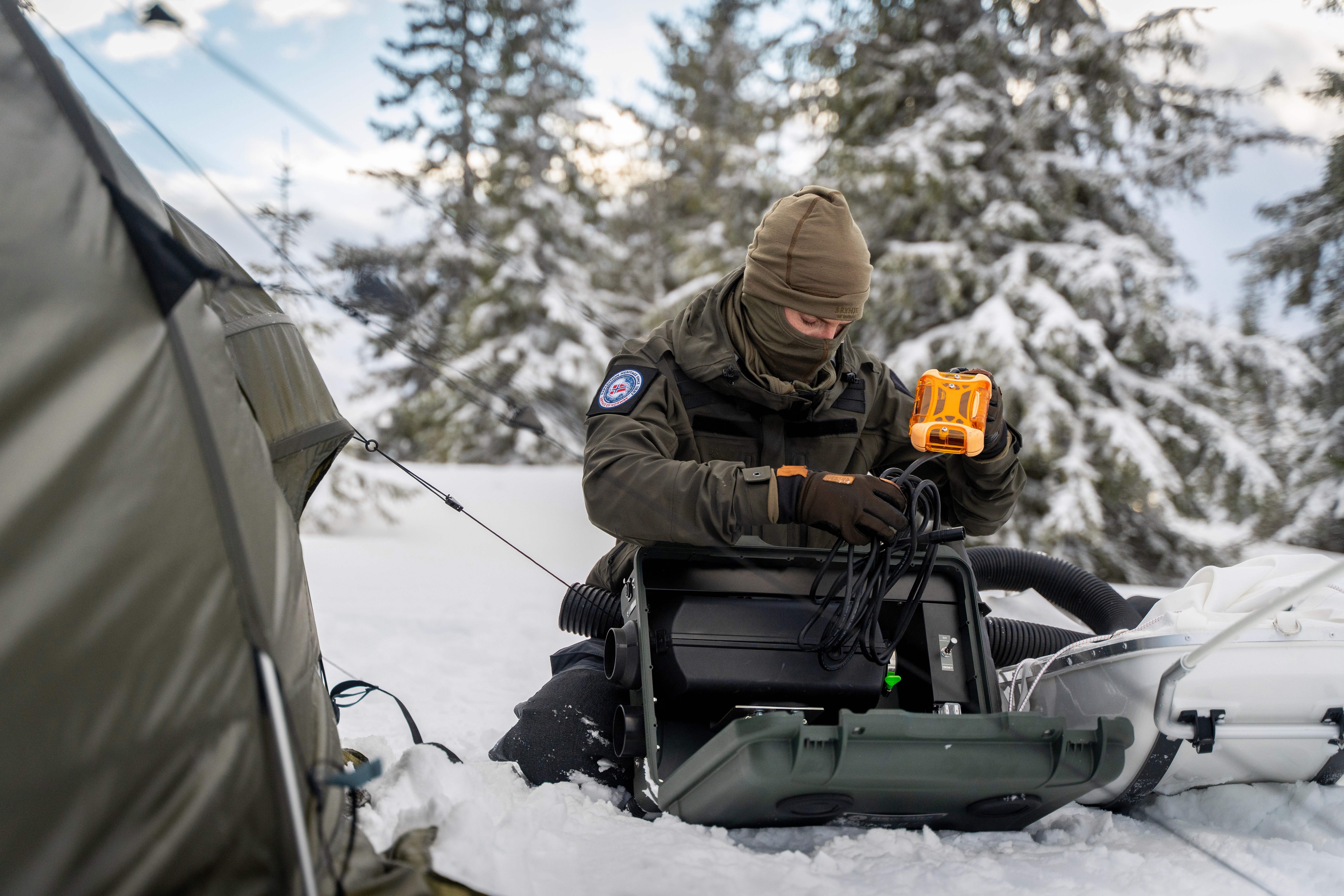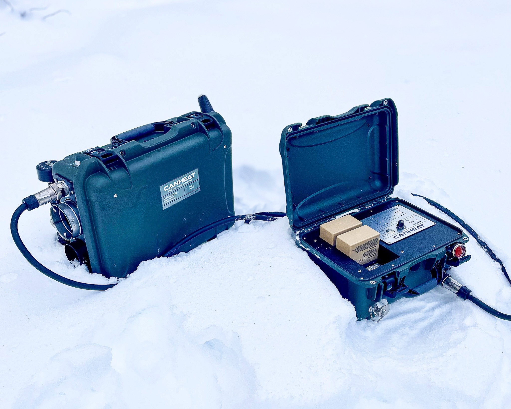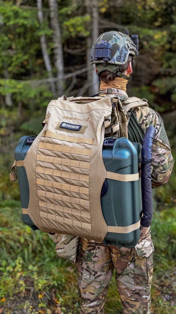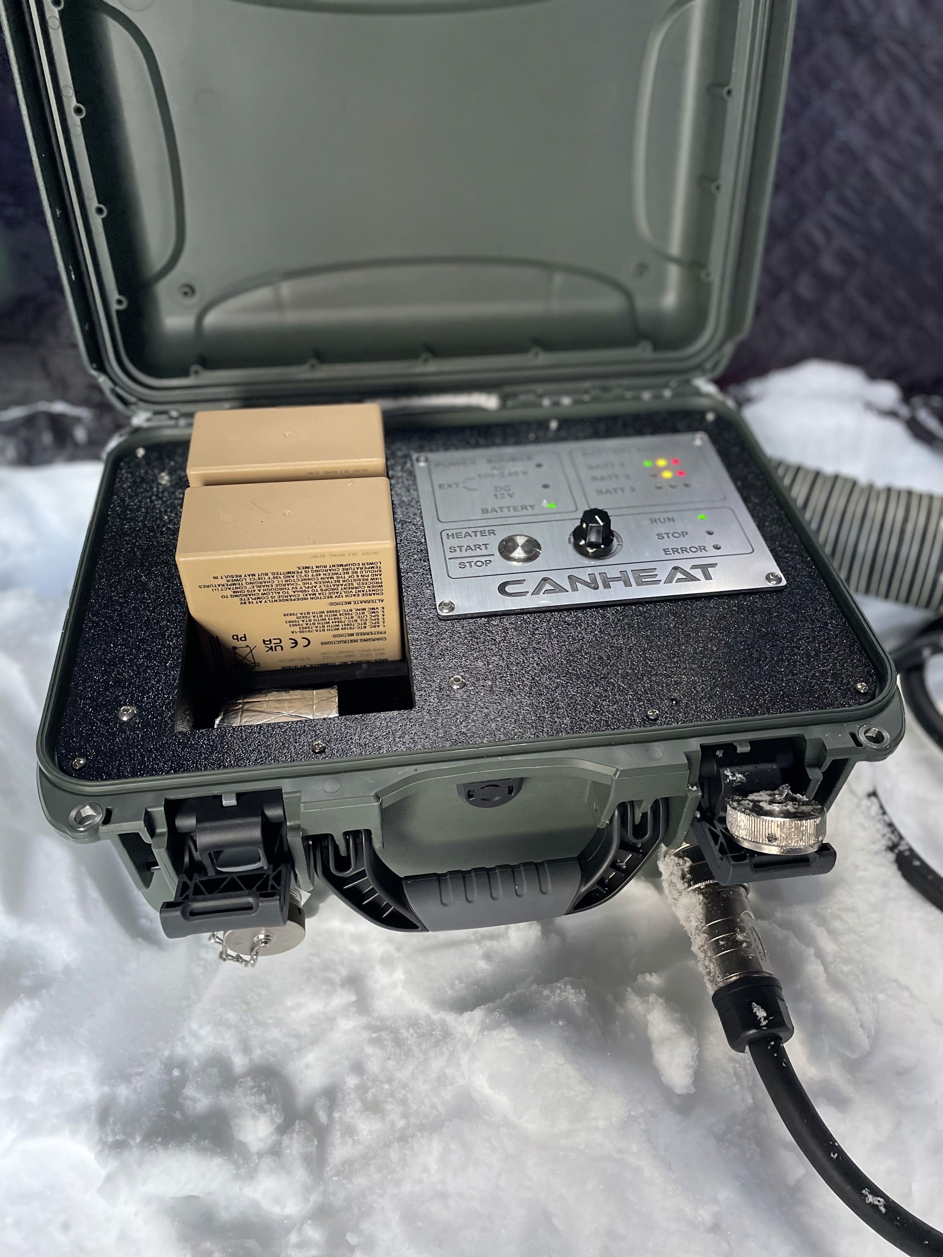 A dual-box heating system built for extended autonomy, drawing power from NATO-standard BB-2590 batteries, or with external AC and DC inputs. Compact and self-contained, it delivers silent heat in off-grid environments.