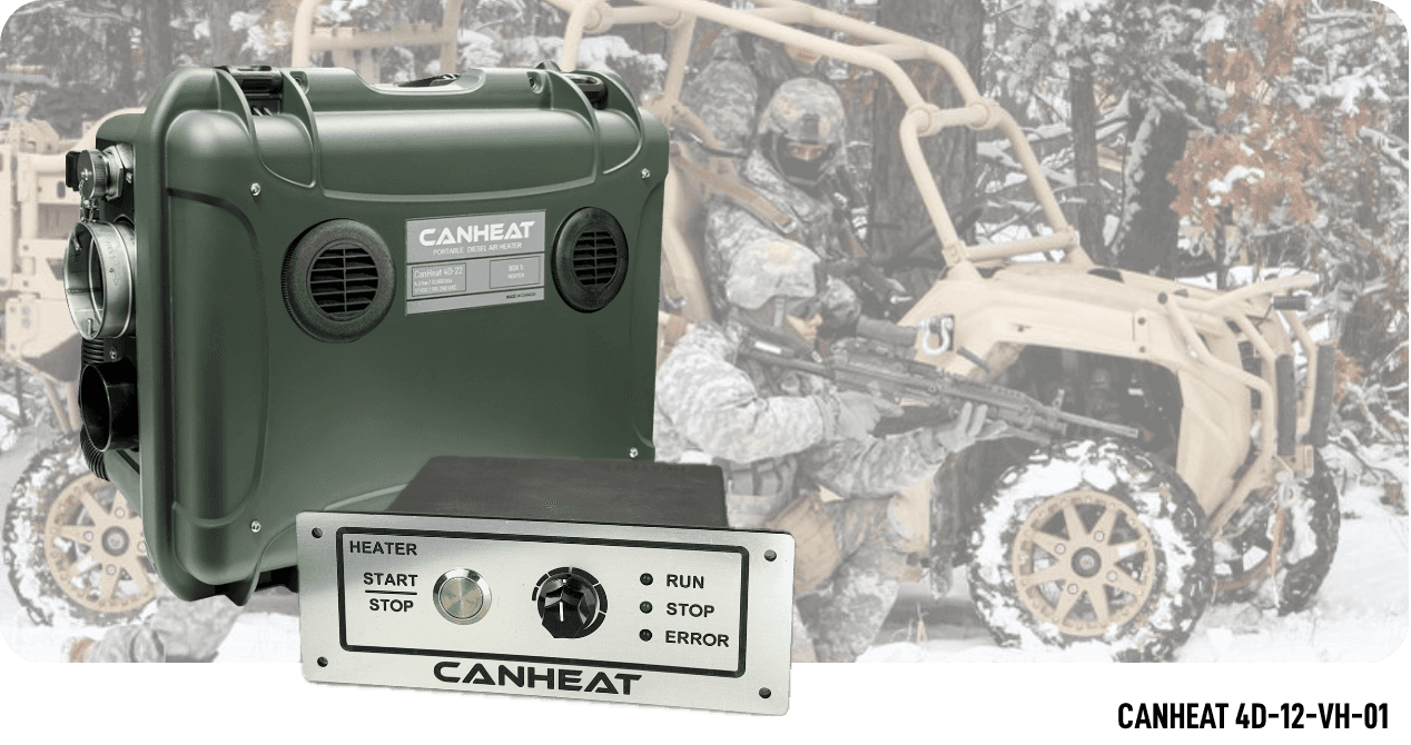 A vehicle-mounted heating system built for Ultra Light Tactical Vehicles such as Polaris DAGOR, Polaris MRZR, and GM Defense ISV. Compact and integrated, it delivers cab-safe heating, dashboard control, and rapid ducted airflow, with the flexibility to quick-disconnect for shelter use when required.